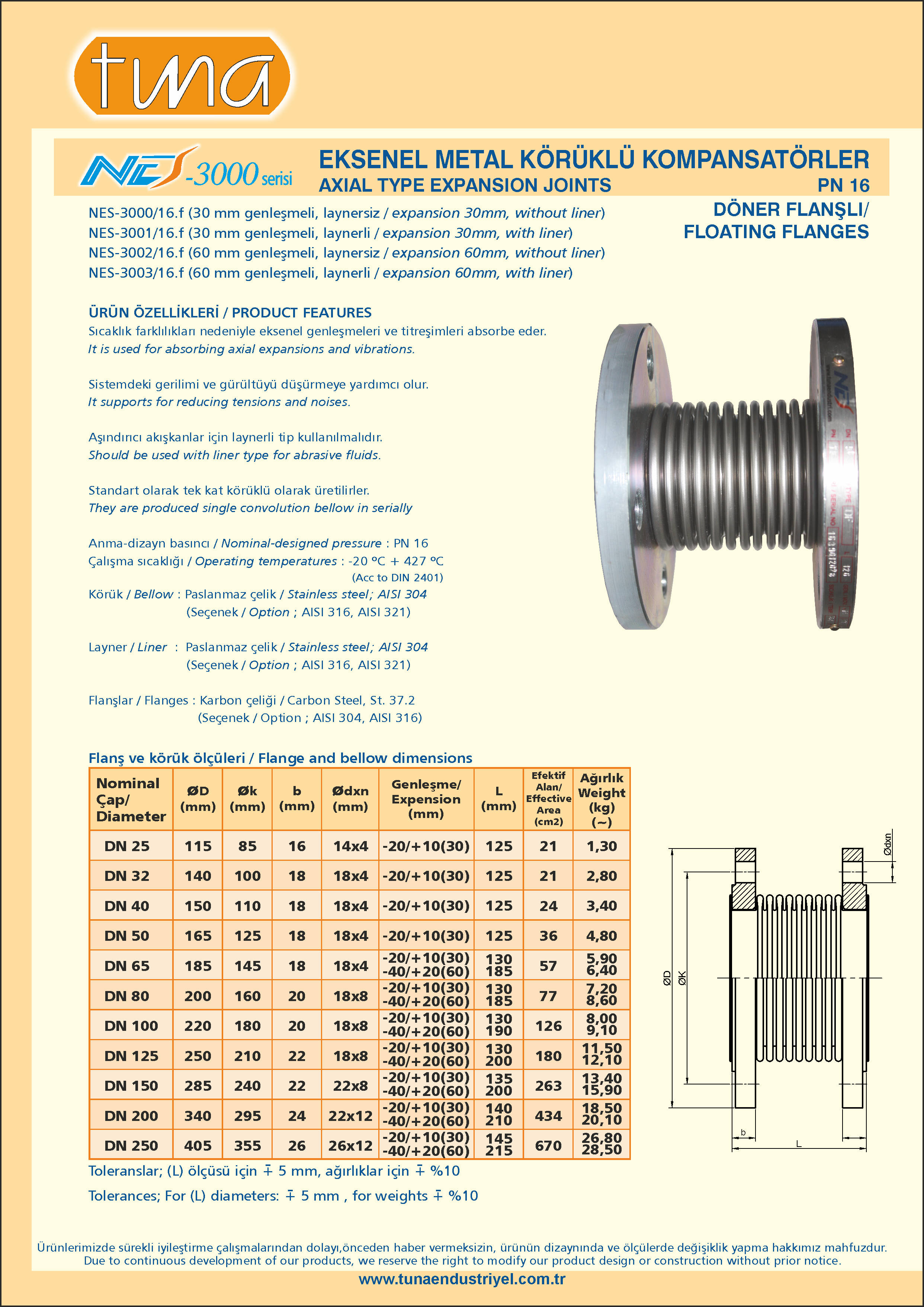Basınç Sınıfı : PN16 / PN25 Körük : Paslanmaz çelik Flanş : Karbon çelik Genleşme : 30 mm / 60 mm Flanşlı